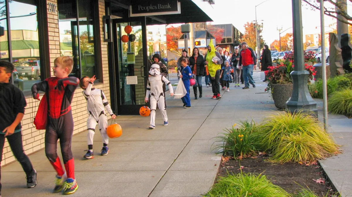 Kid-friendly Halloween fun with costumes, candy, and games along Wetmore and Hewitt.