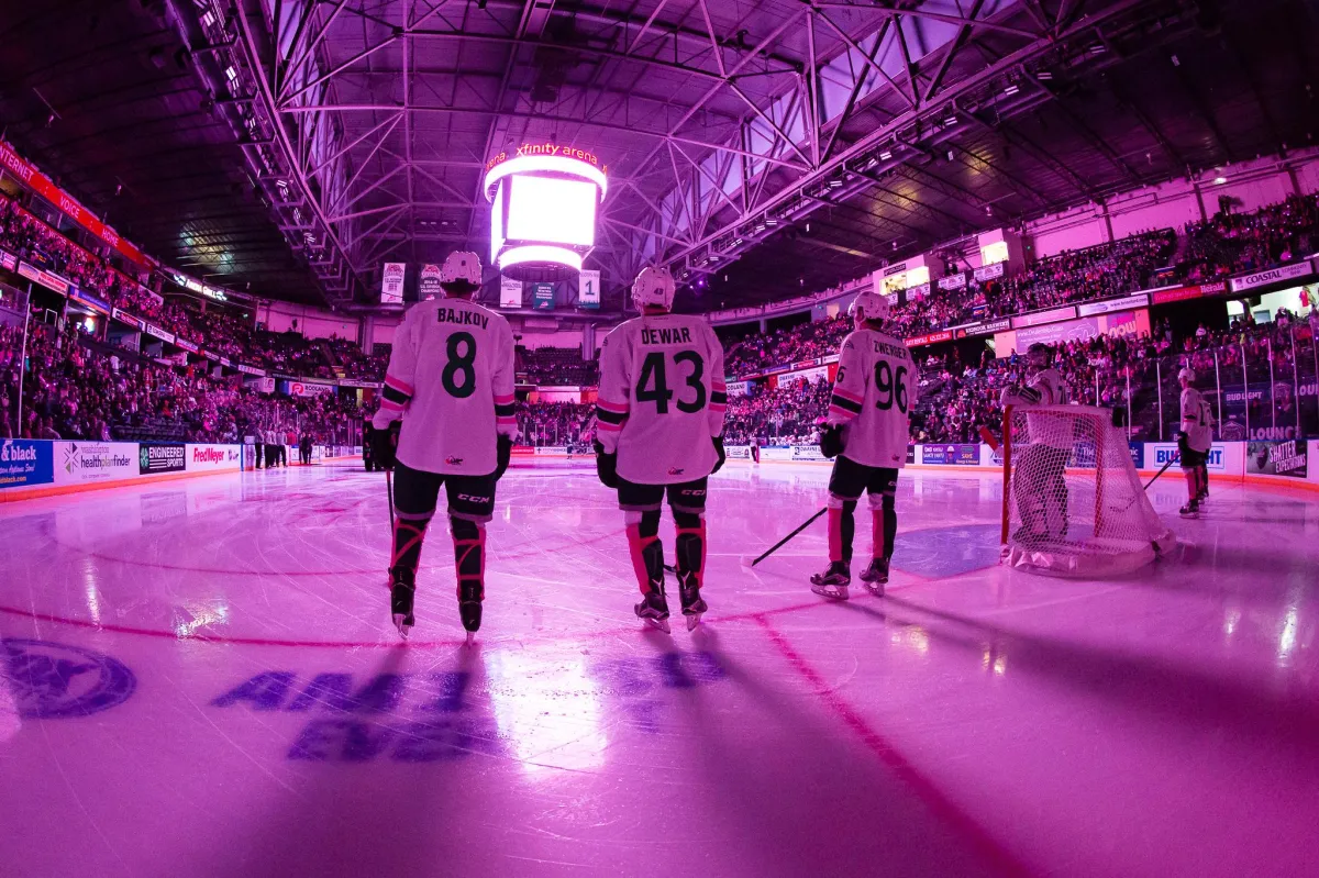 Annual hockey game at Angel of the Winds Arena supporting cancer awareness, featuring pink jerseys and a high-energy crowd.